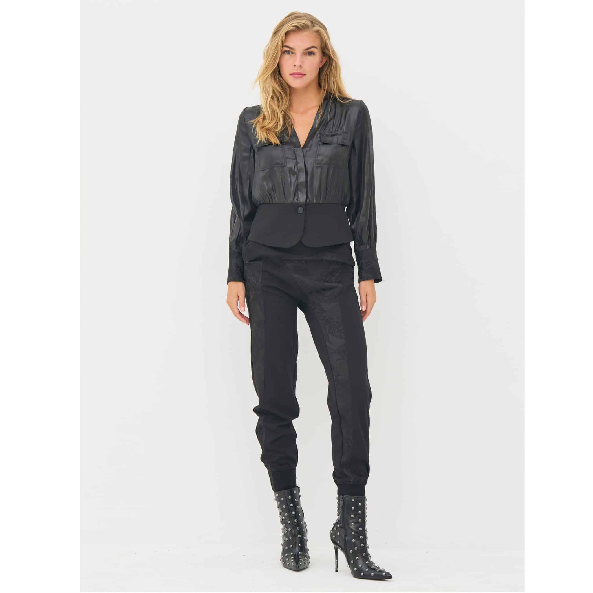 Denne skjorte kombinerer elegance og moderne design på smukkeste vis. Det blanke materiale og den bløde drapering giver et eksklusivt udtryk, mens den dybe V-udskæring og de to brystlommer med flap tilfører et stilrent look. Skjorten fremhæver taljen med en bred linning og knaplukning, der skaber en smigrende pasform.