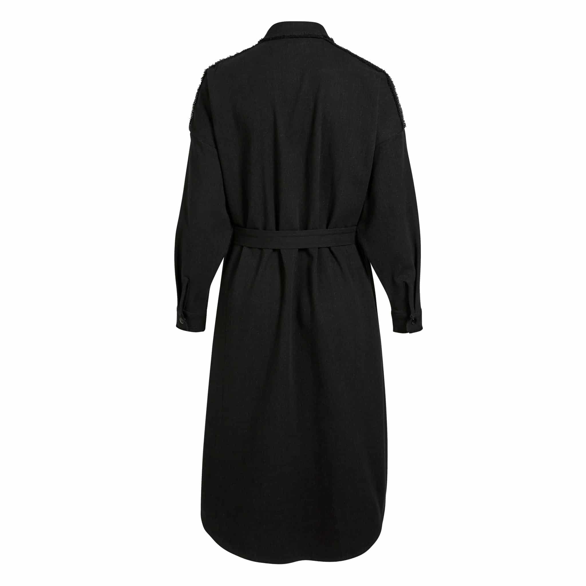 Denne skjortekjole forener klassiske snit med rå, moderne detaljer. Den lige pasform kombineres med skjortekrave, gennemgående knaplukning og lange ærmer, mens brystlommer og rå kanter tilføjer et afslappet og cool udtryk.
