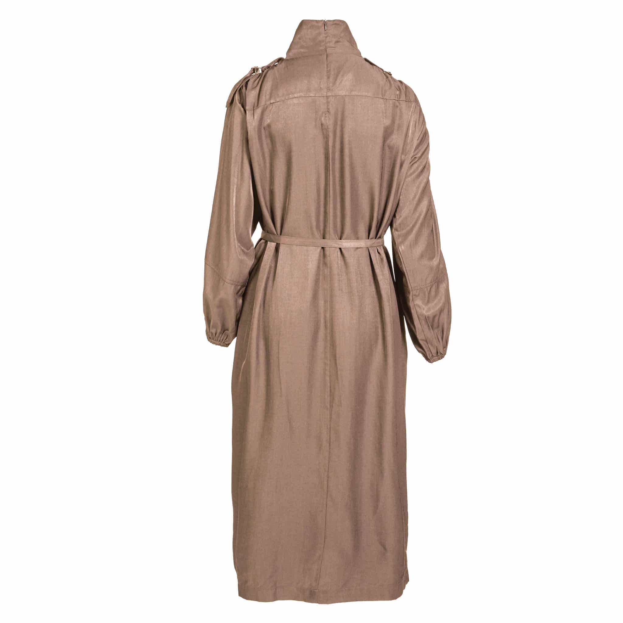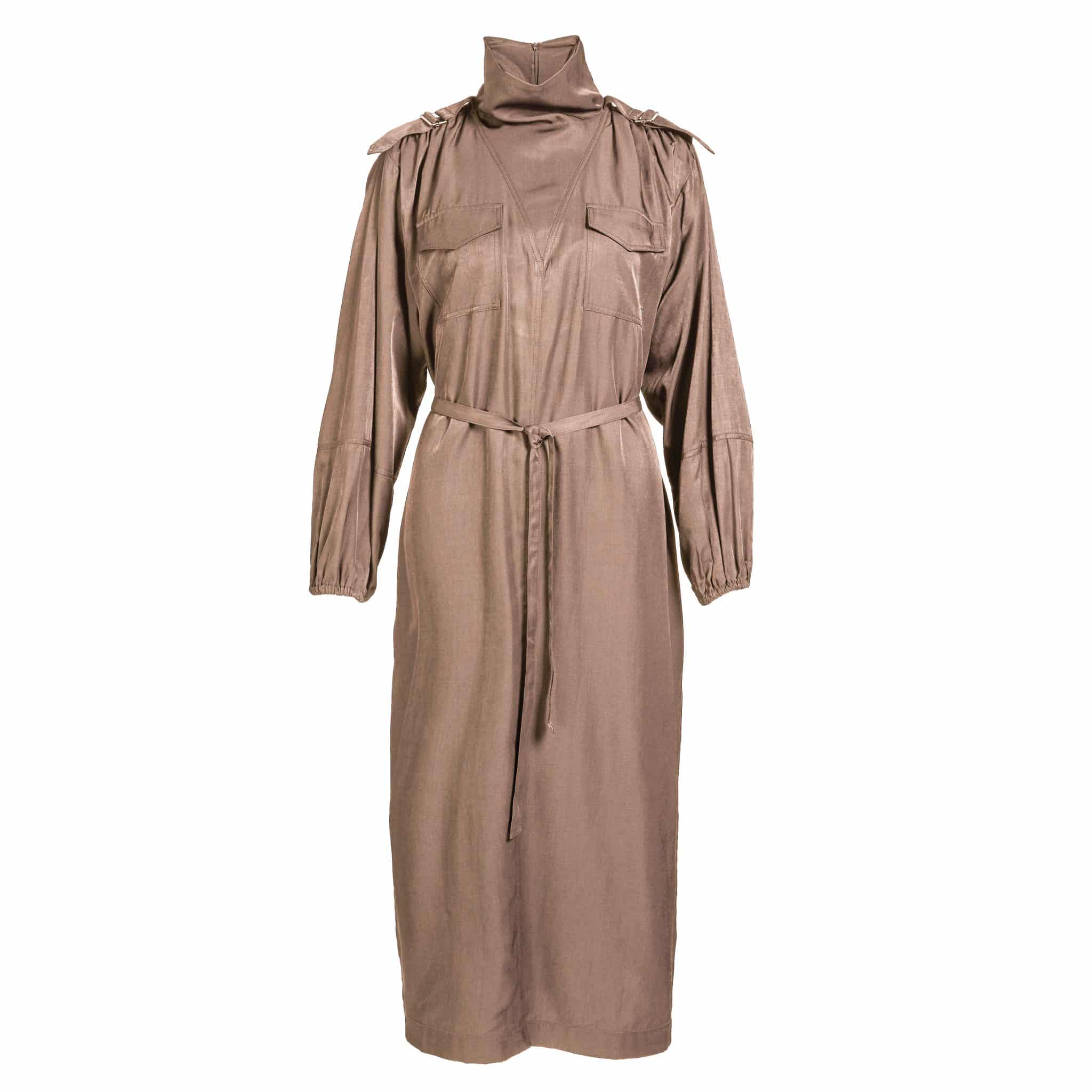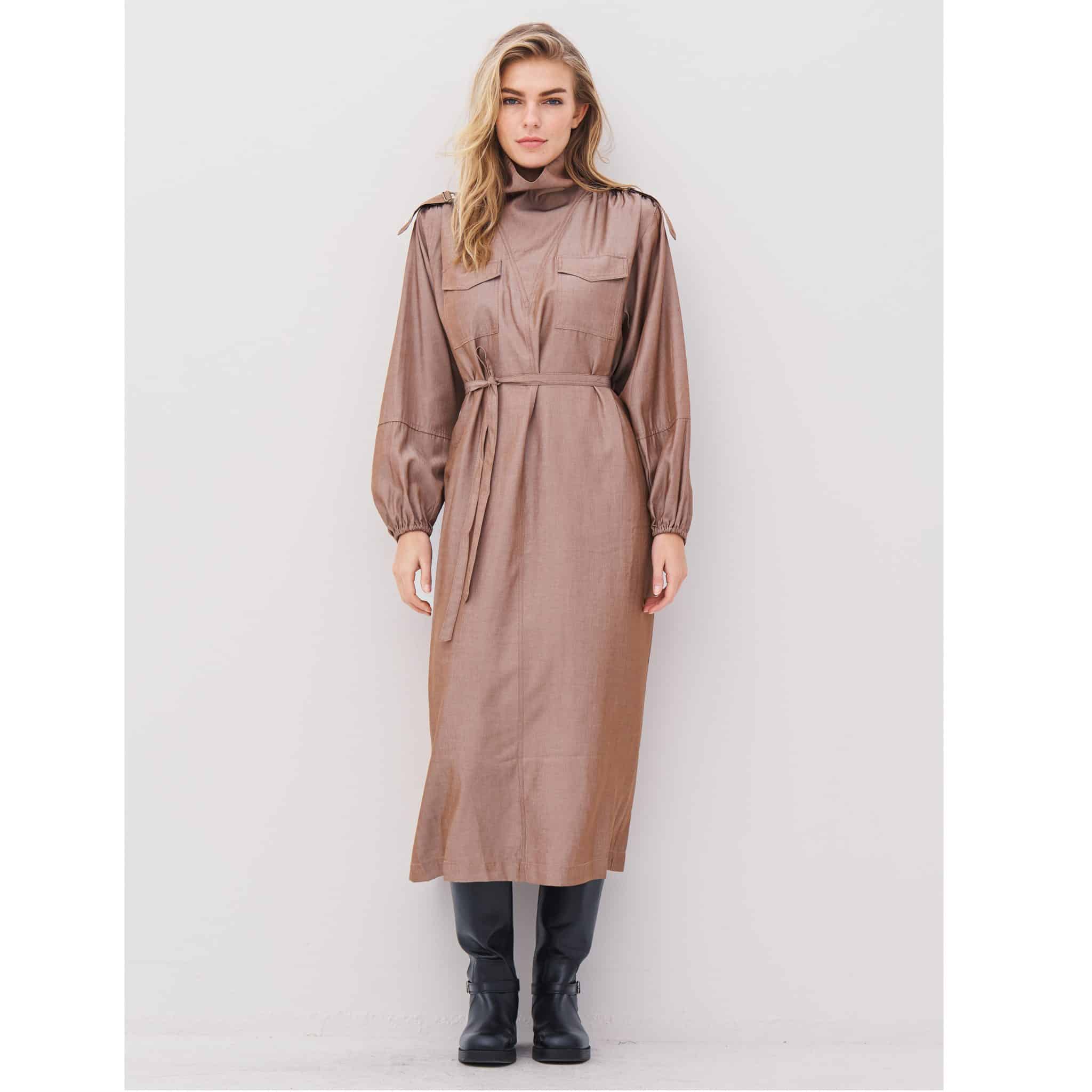 Skab et moderne og selvsikkert look med denne elegante knælange kjole. Designet kombinerer funktionalitet og stil med høj krave, brystlommer med klap og et markeret skulderparti med stropper og knapper. Ærmerne har en let ballonform og afsluttes med elastik ved håndleddet for en behagelig pasform.