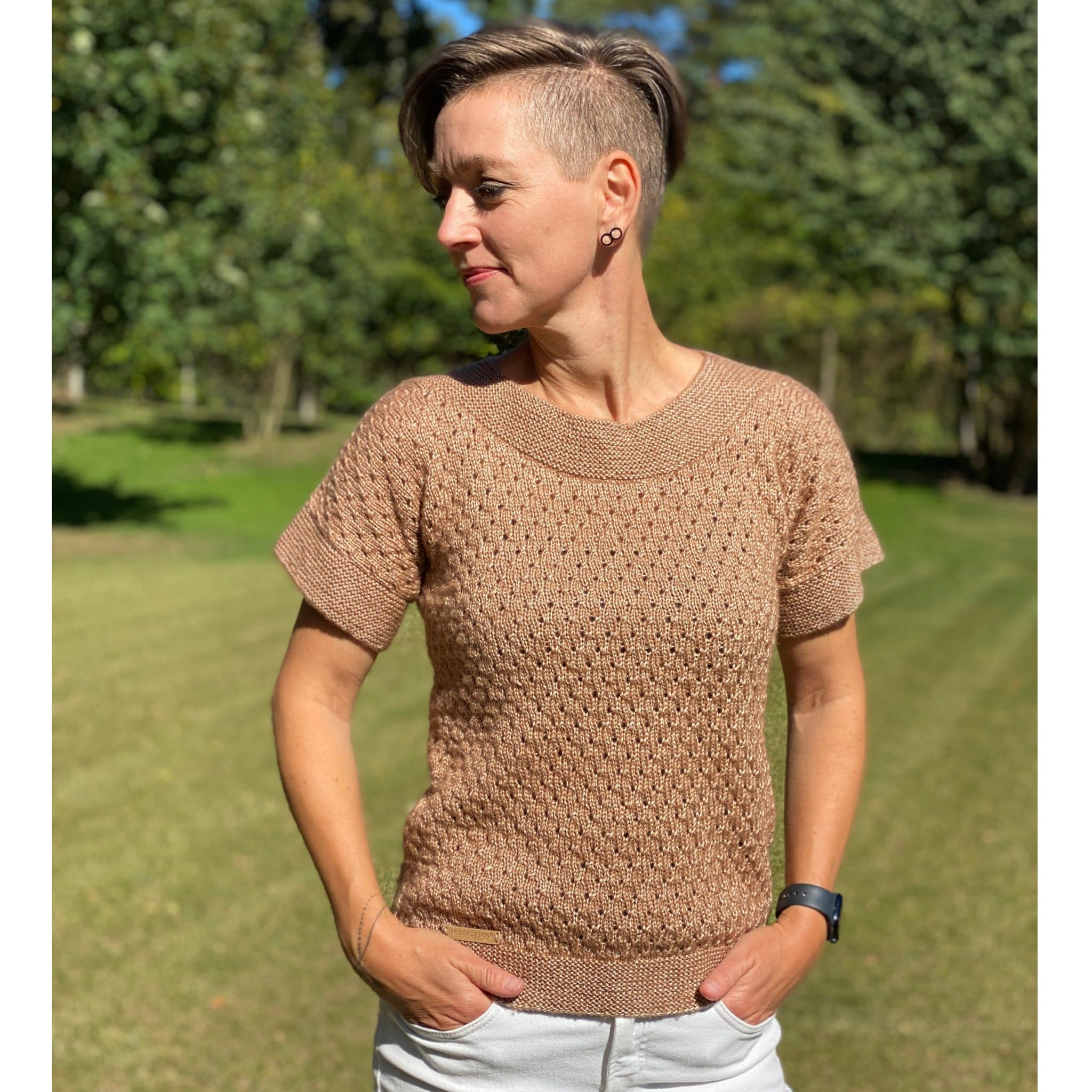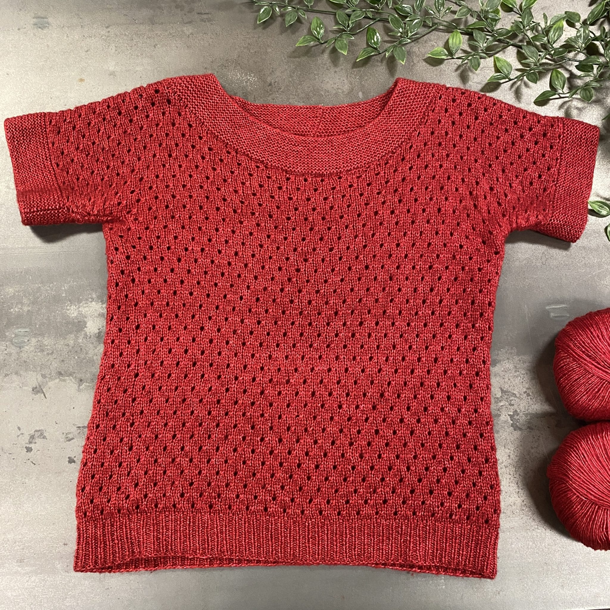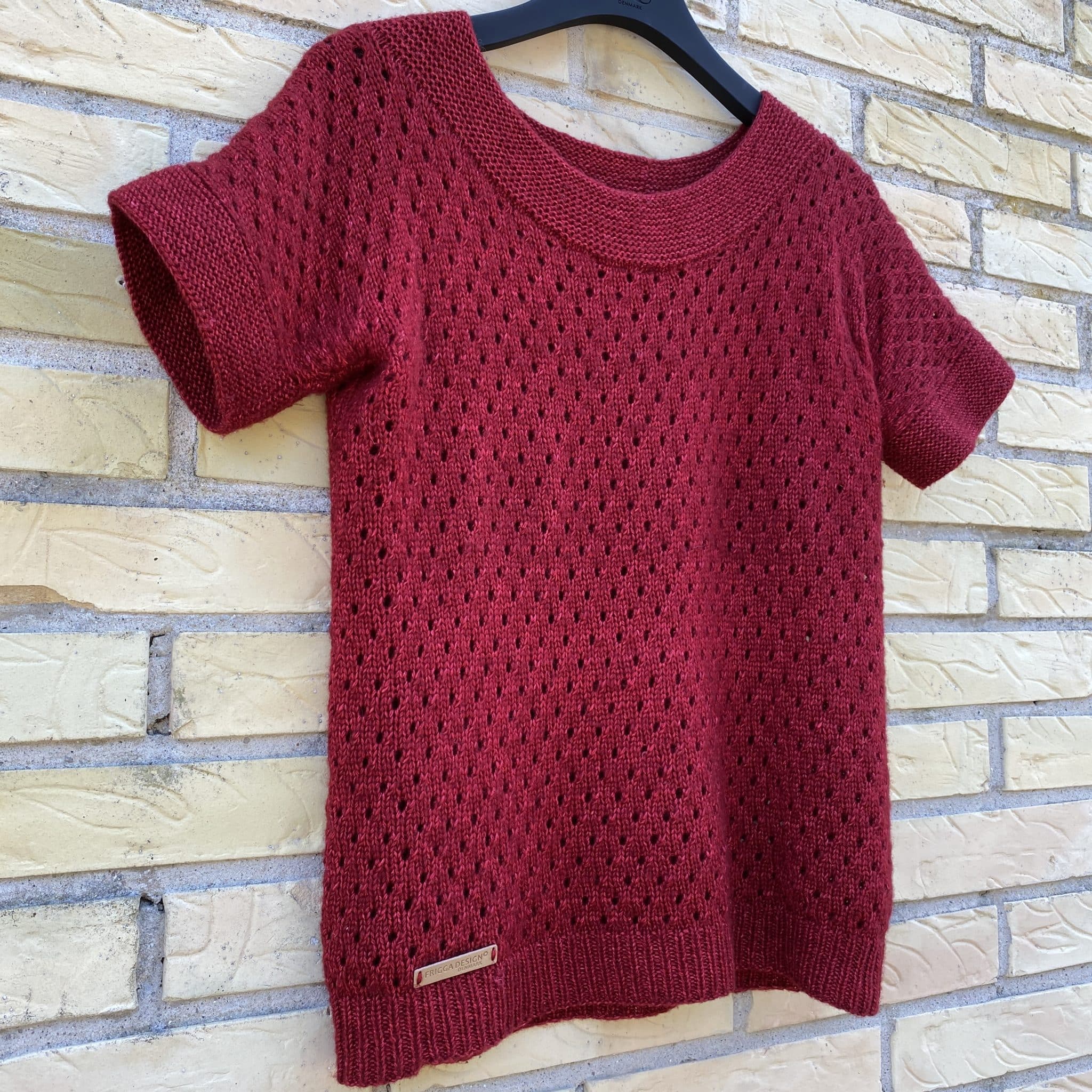 Tshirten er strikket med bredde retrillekanter, og en flot bred halskant. Kroppen har en fint hulmønster hele vejen igennem arbejdet.