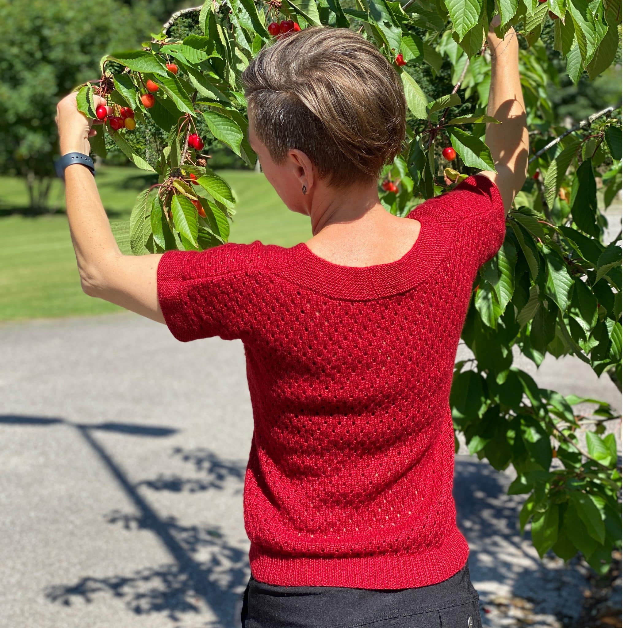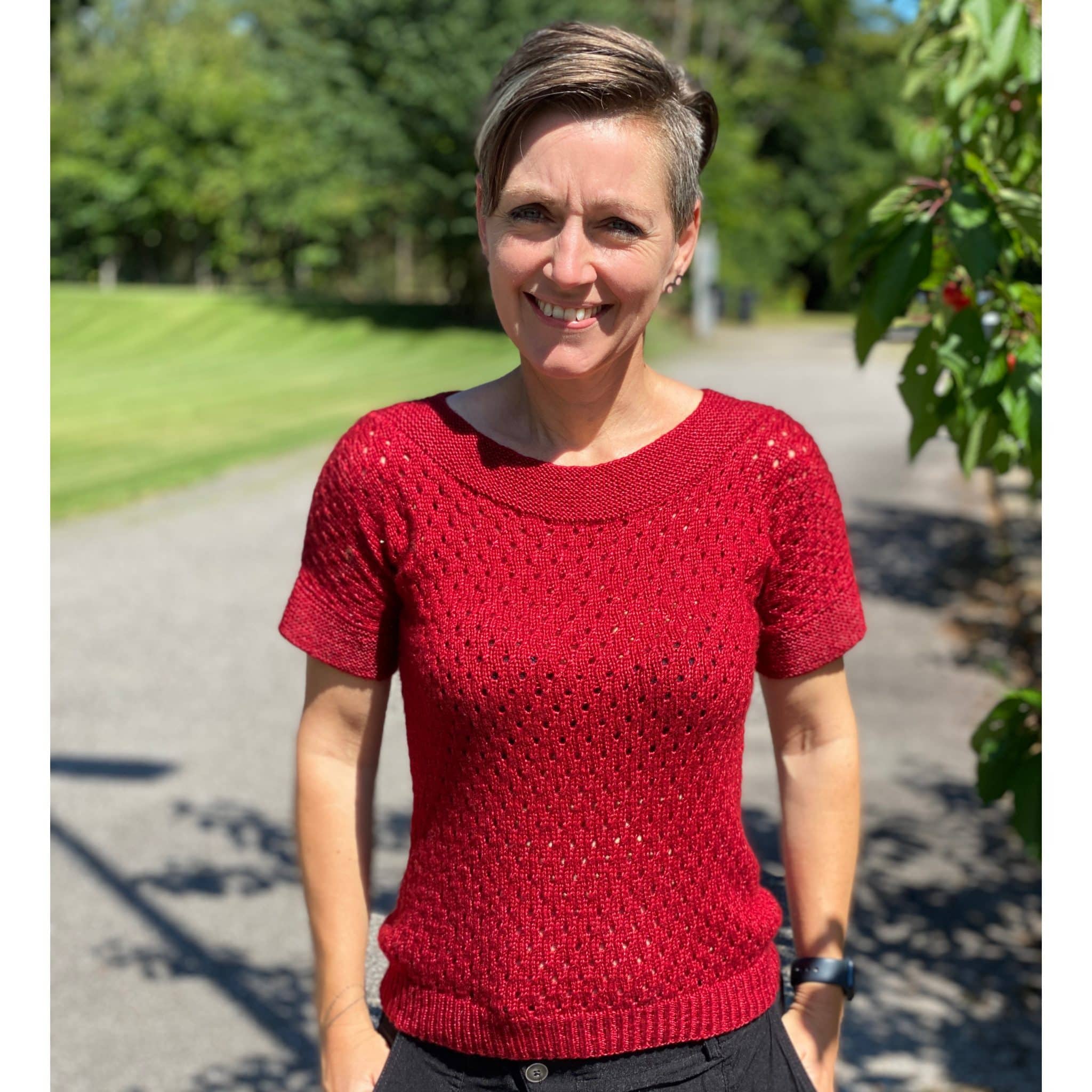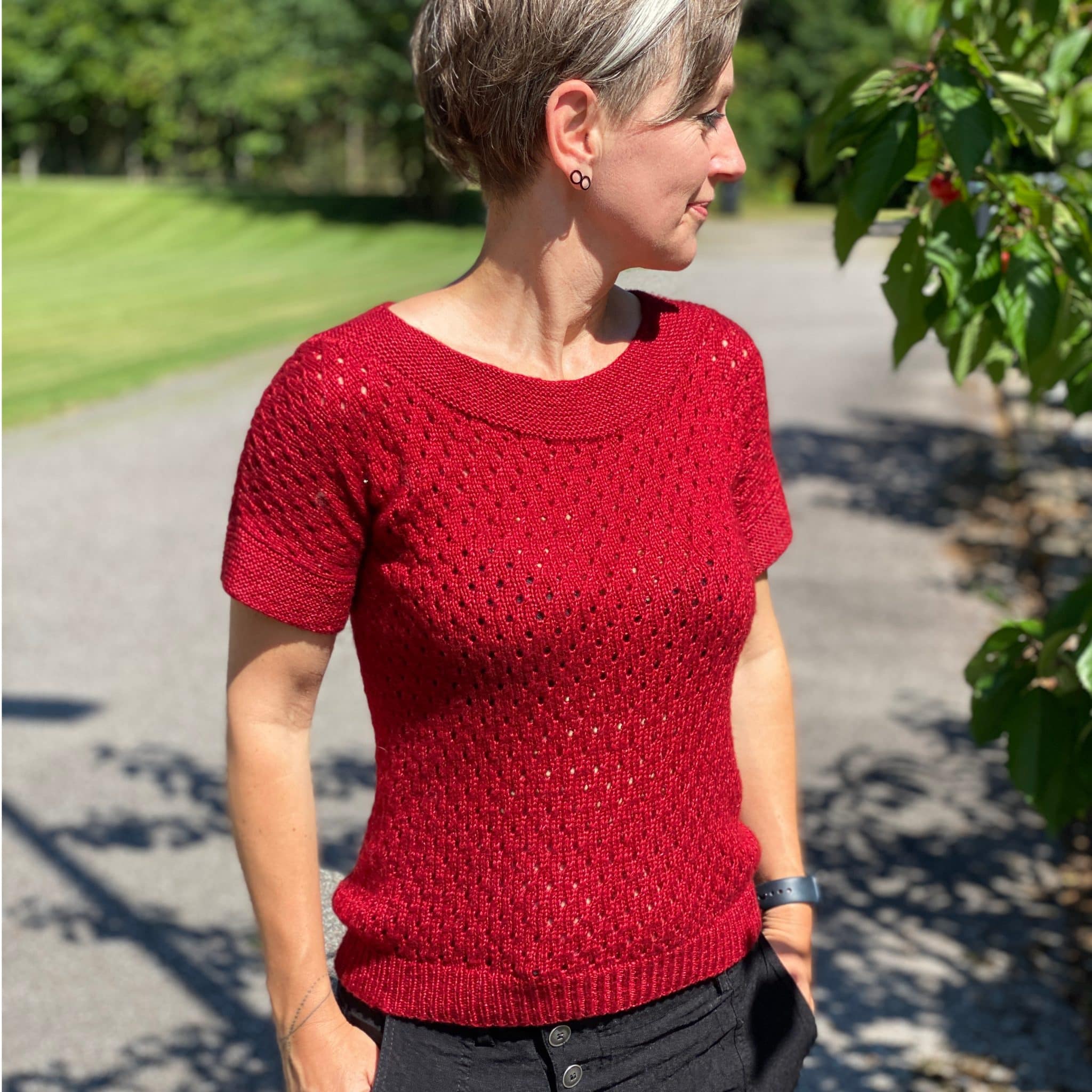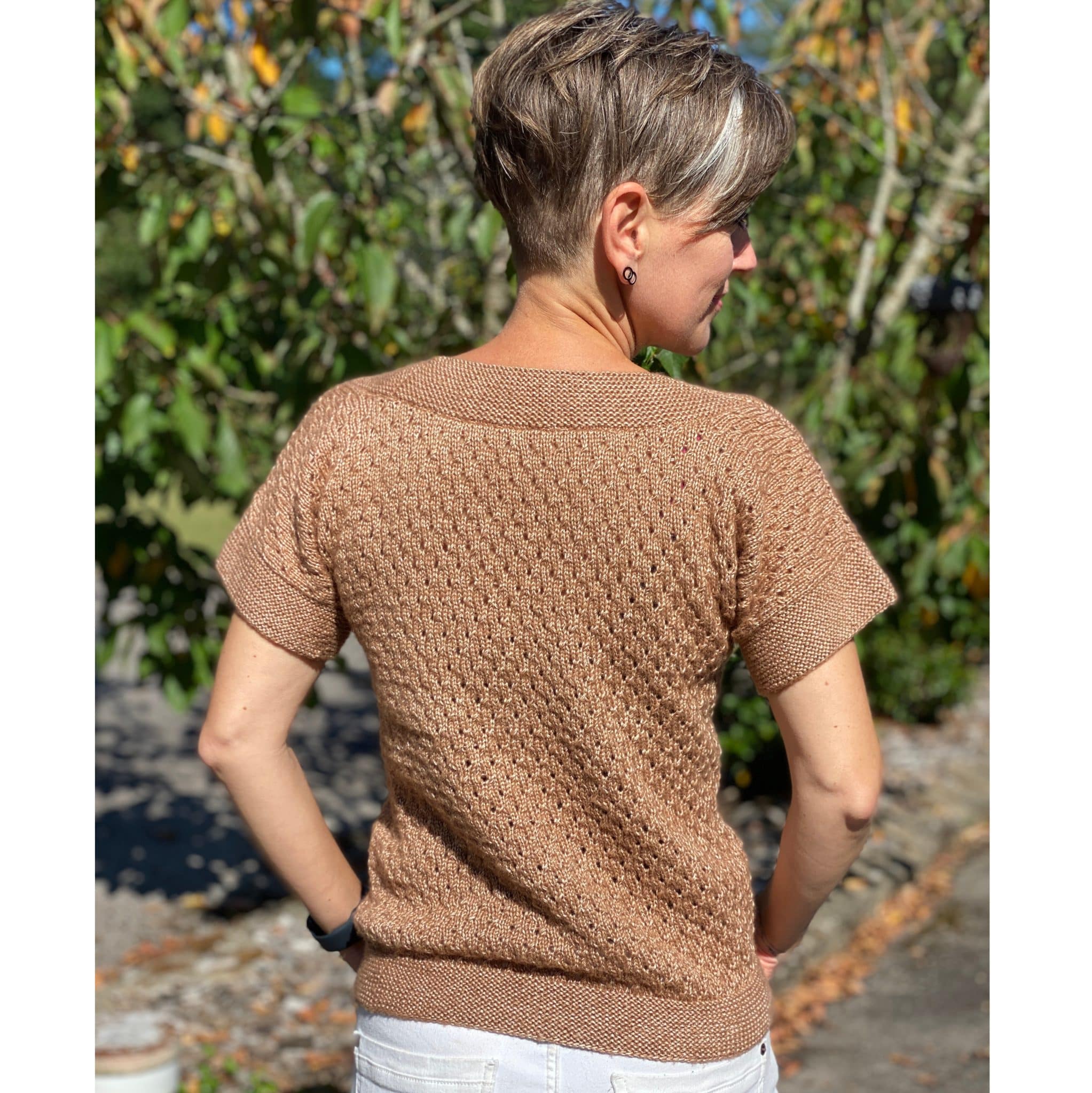Tshirten er strikket med bredde retrillekanter, og en flot bred halskant. Kroppen har en fint hulmønster hele vejen igennem arbejdet.