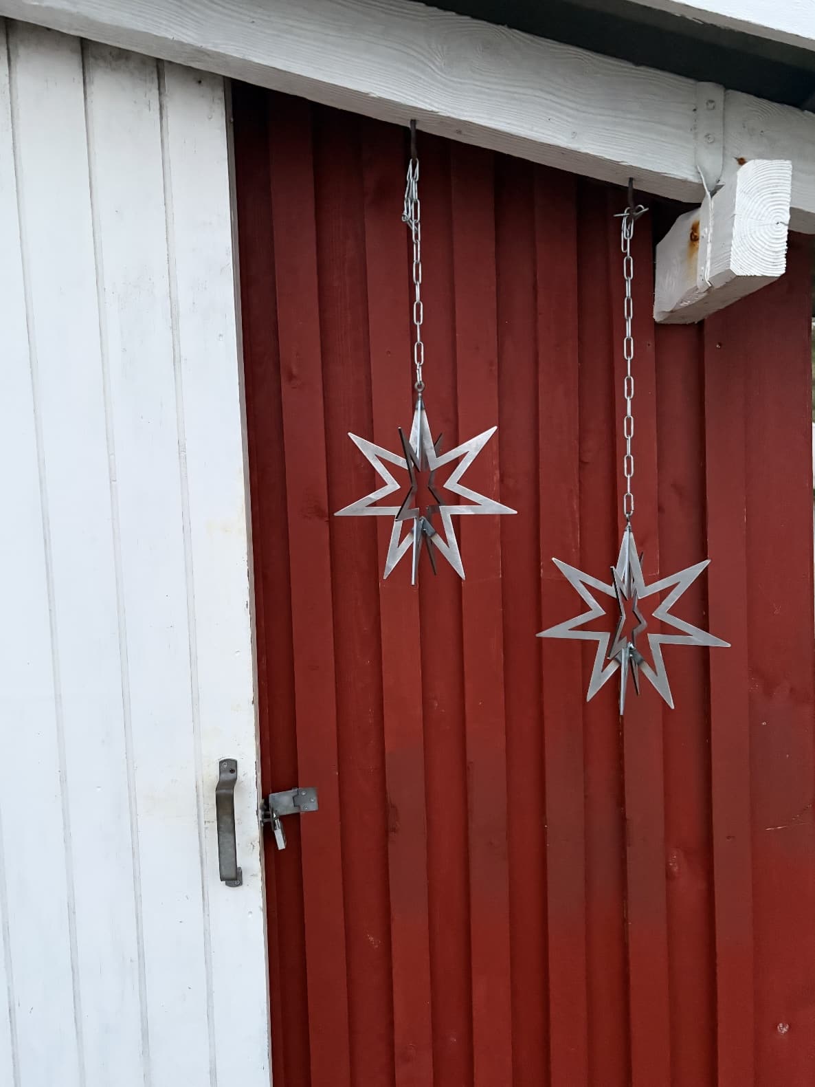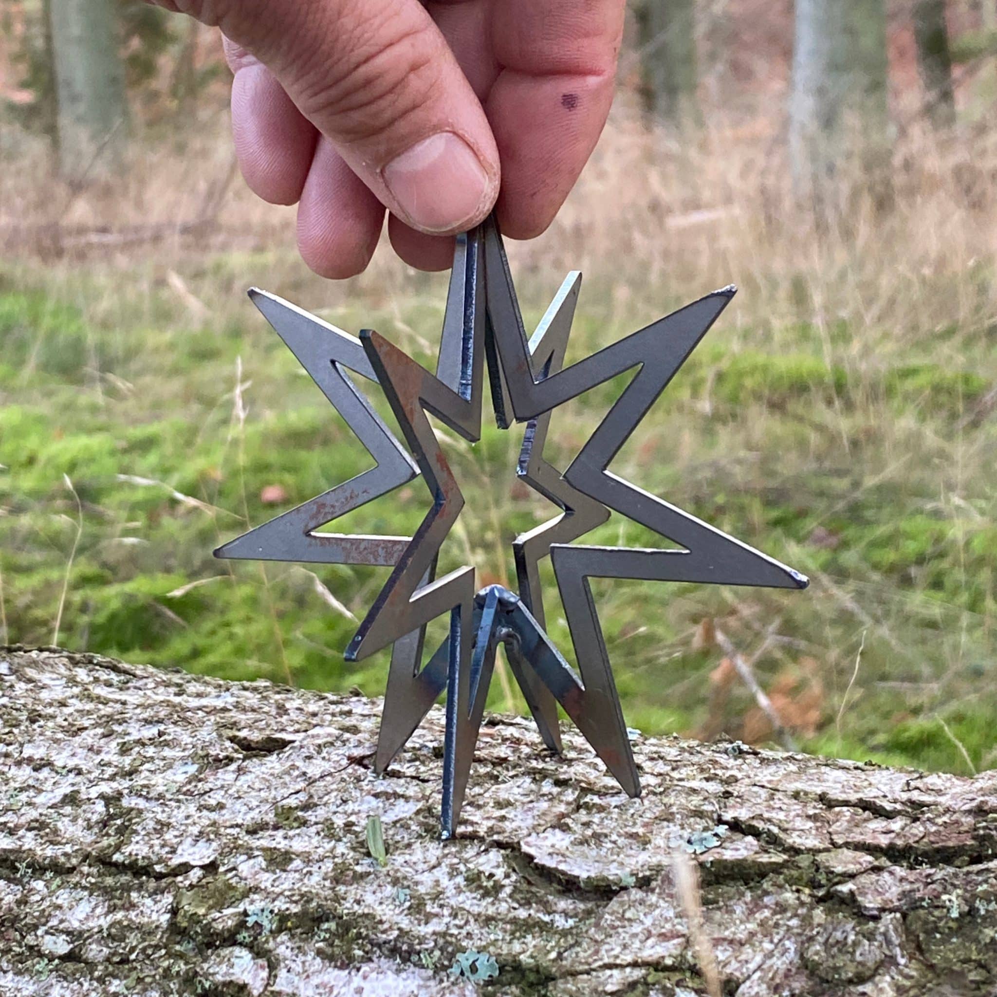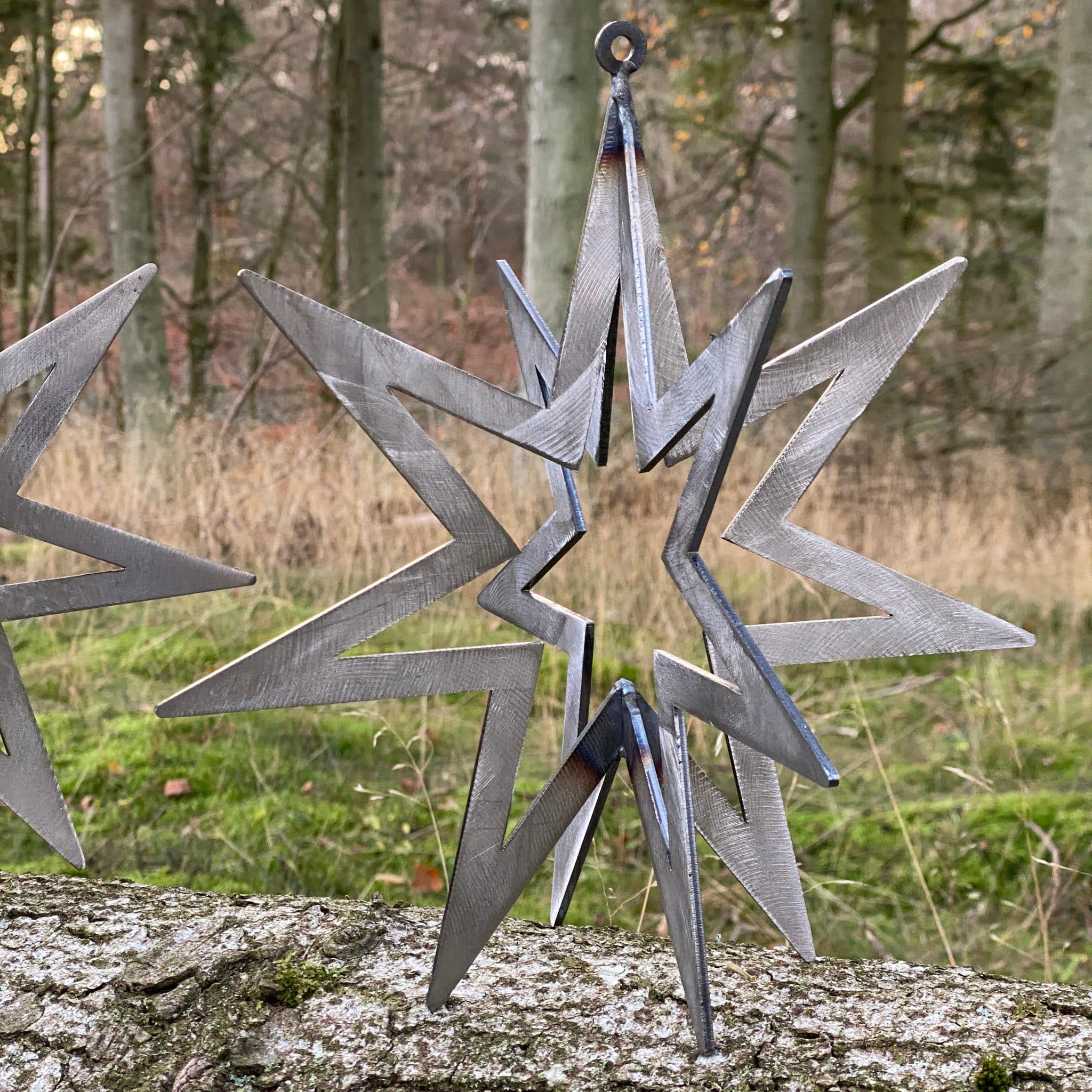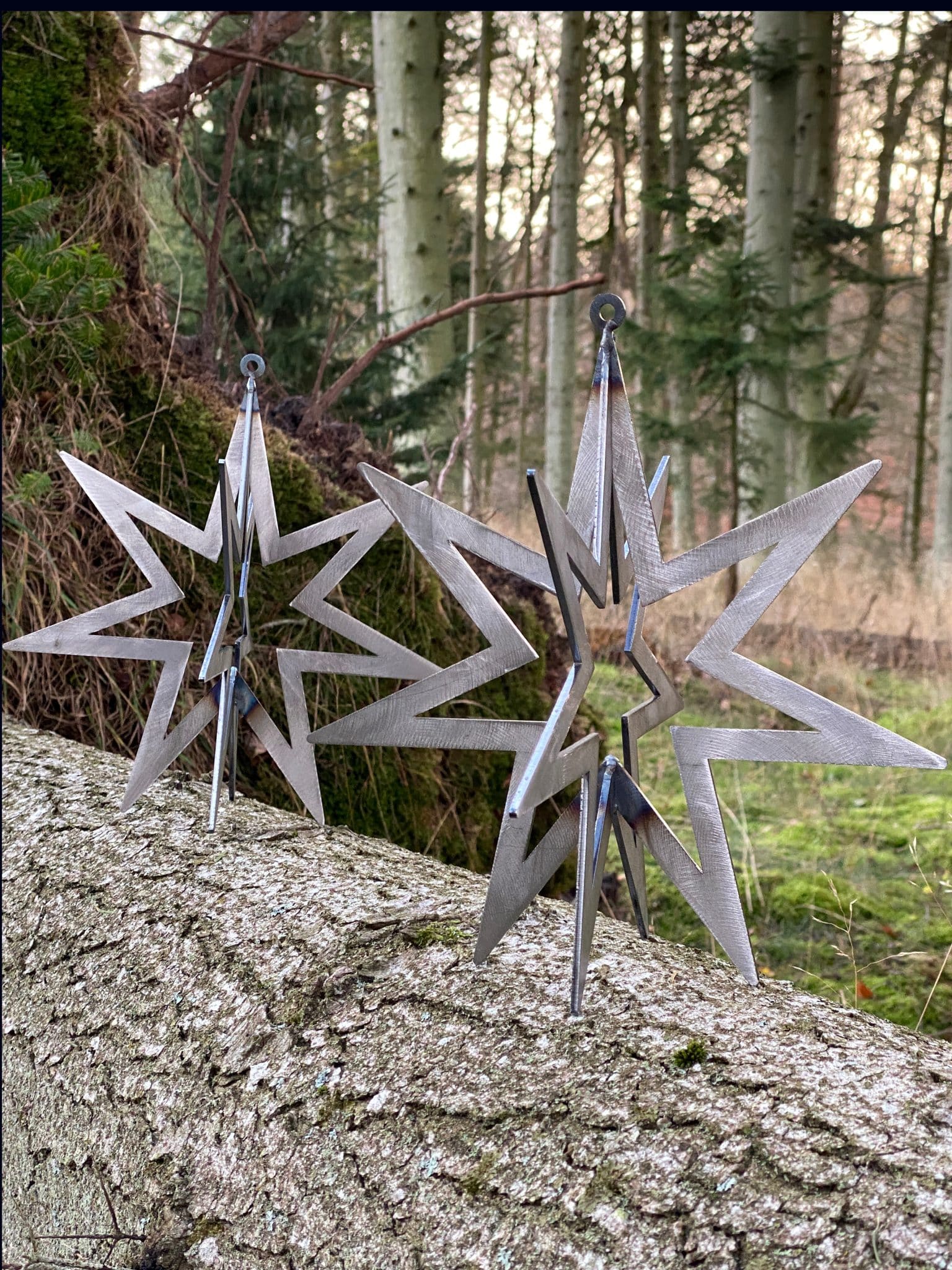Disse unikke stjerner er håndlavet af en min kære mand Thomas (Vesterø Smedje). Stjernerne kombinerer traditionelt smukt håndværk med et moderne, geometrisk udtryk. Resultatet er en dekorativ stålstjerne i 3 forskellige størrelser med et skarpt, skulpturelt look, der fanger lyset smukt og skaber et elegant blikfang i hjemmet.