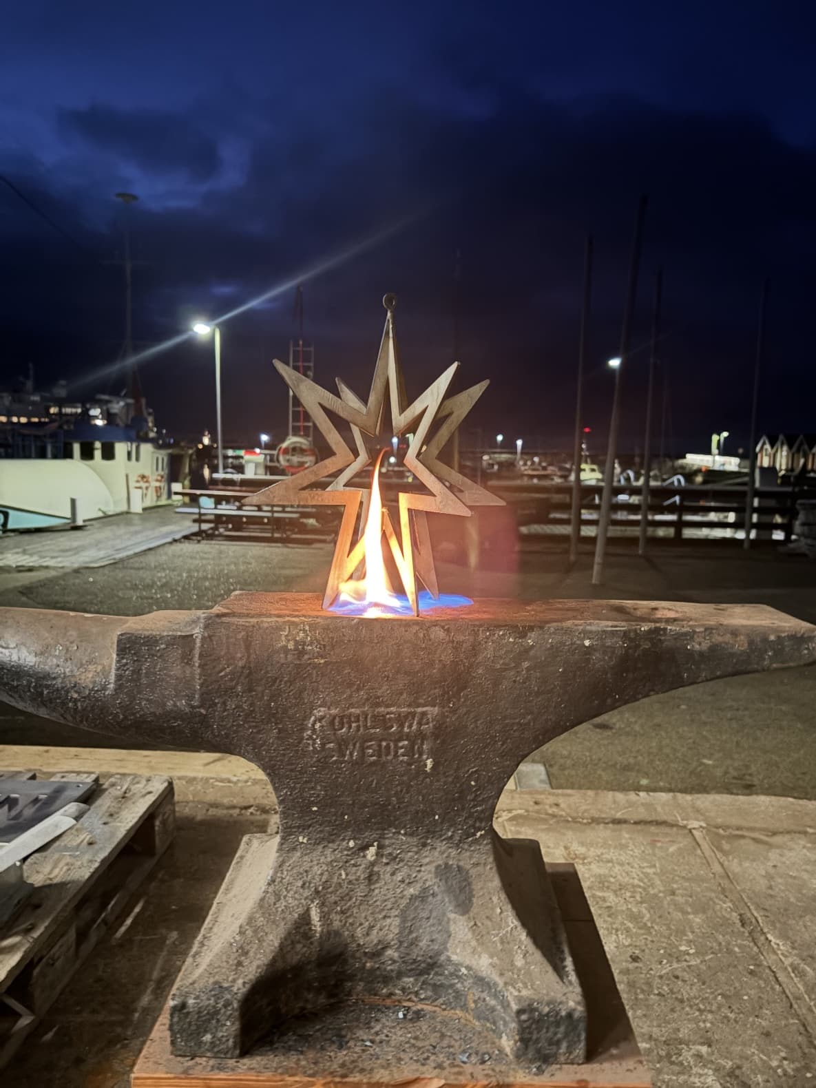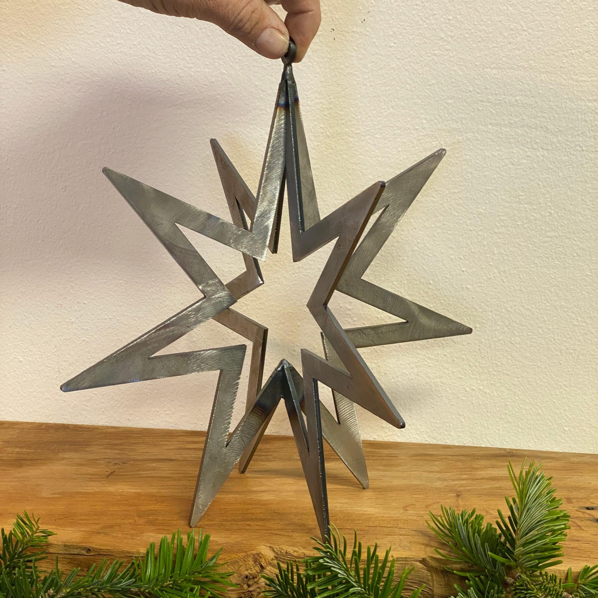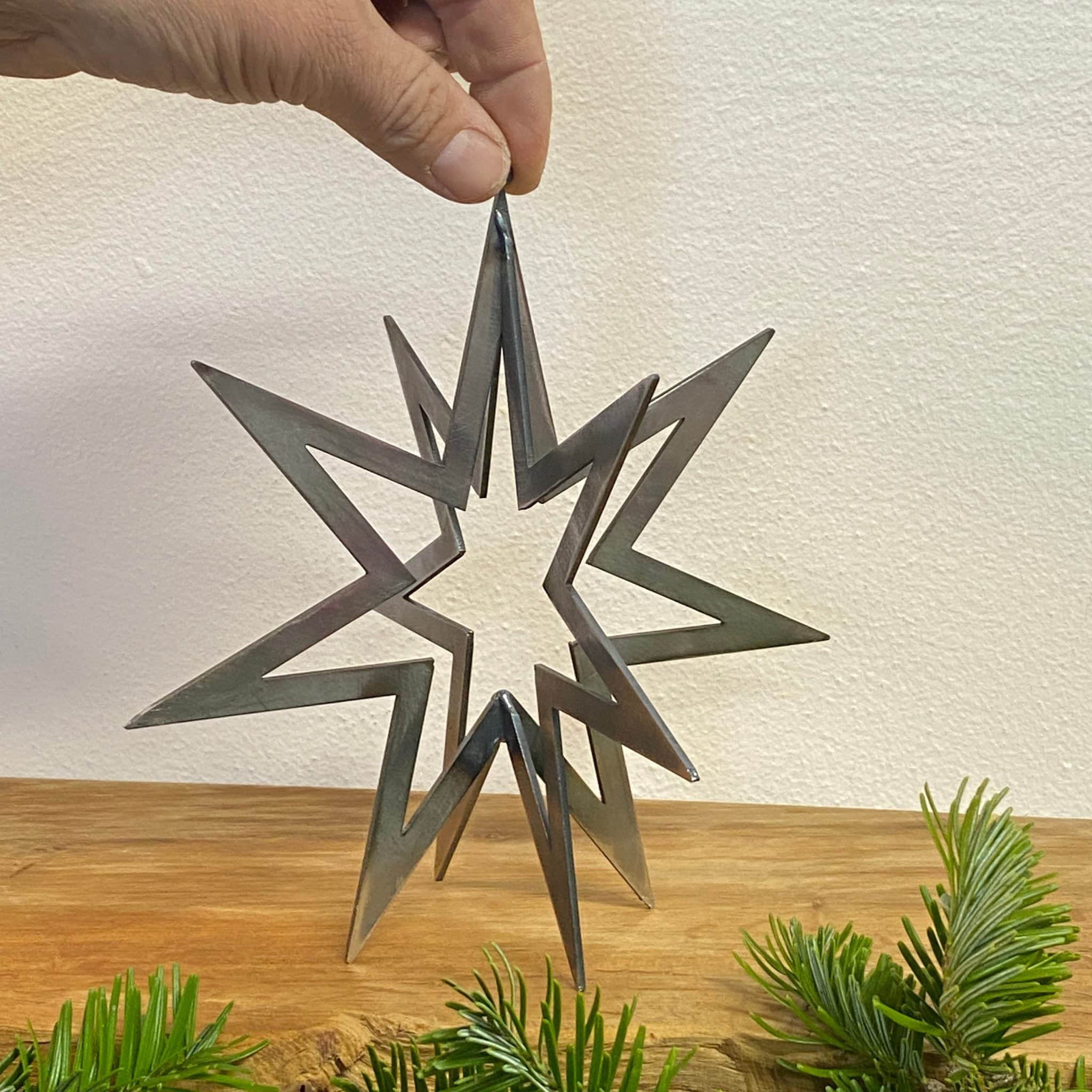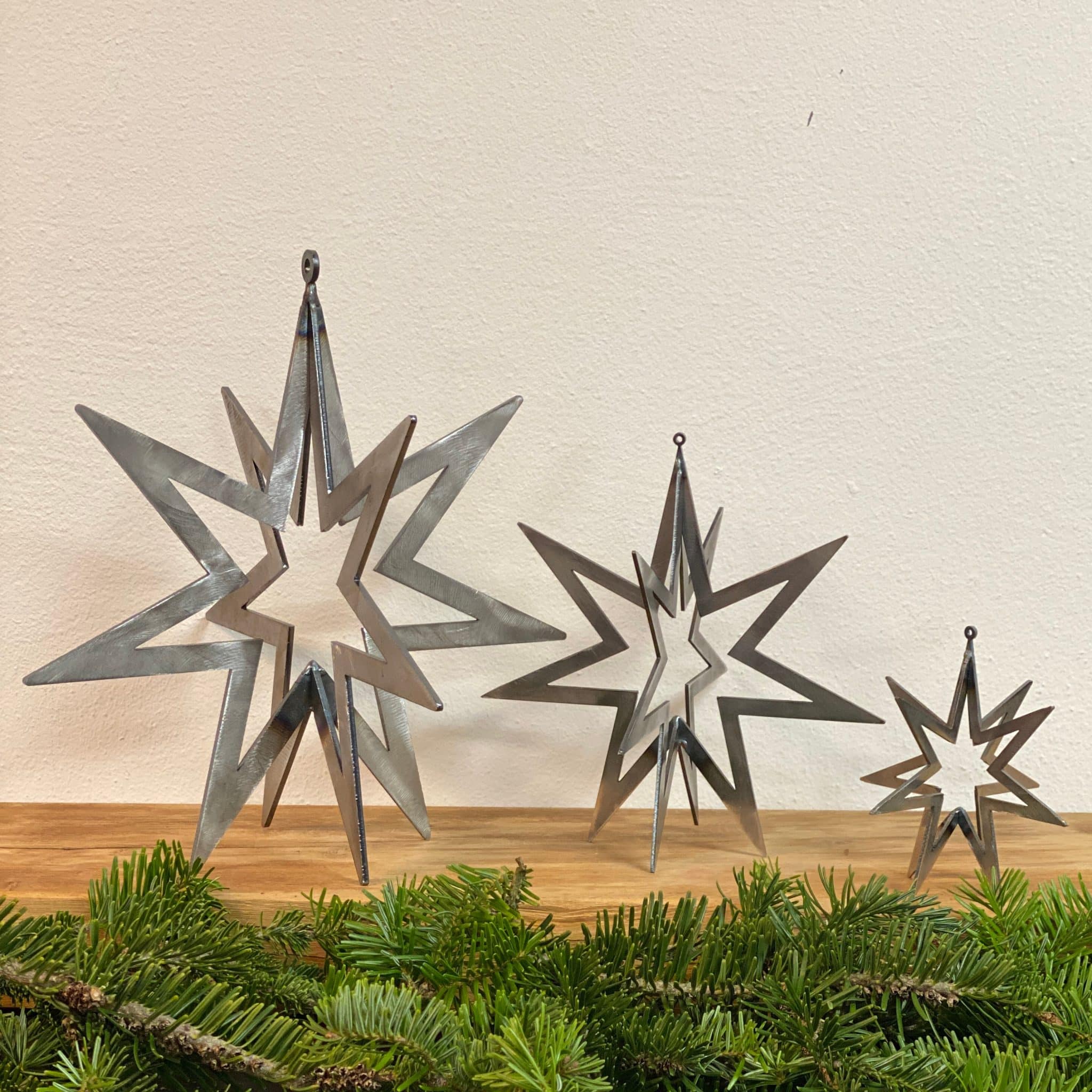 Disse unikke stjerner er håndlavet af en min kære mand Thomas (Vesterø Smedje). Stjernerne kombinerer traditionelt smukt håndværk med et moderne, geometrisk udtryk. Resultatet er en dekorativ stålstjerne i 3 forskellige størrelser med et skarpt, skulpturelt look, der fanger lyset smukt og skaber et elegant blikfang i hjemmet.