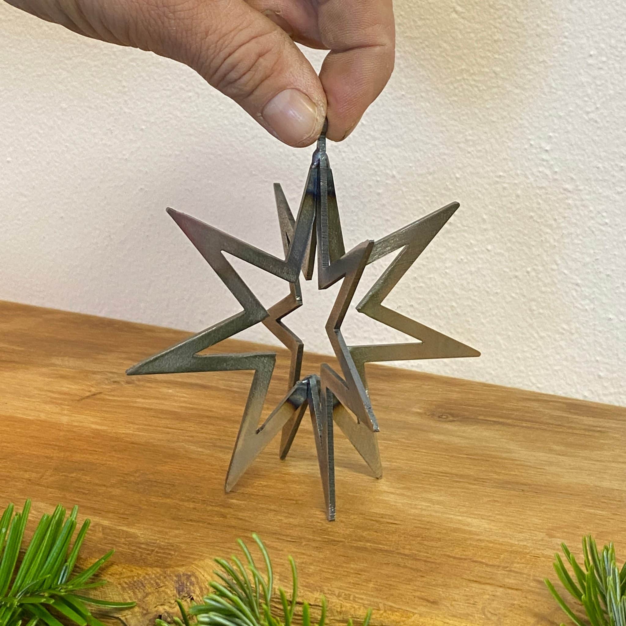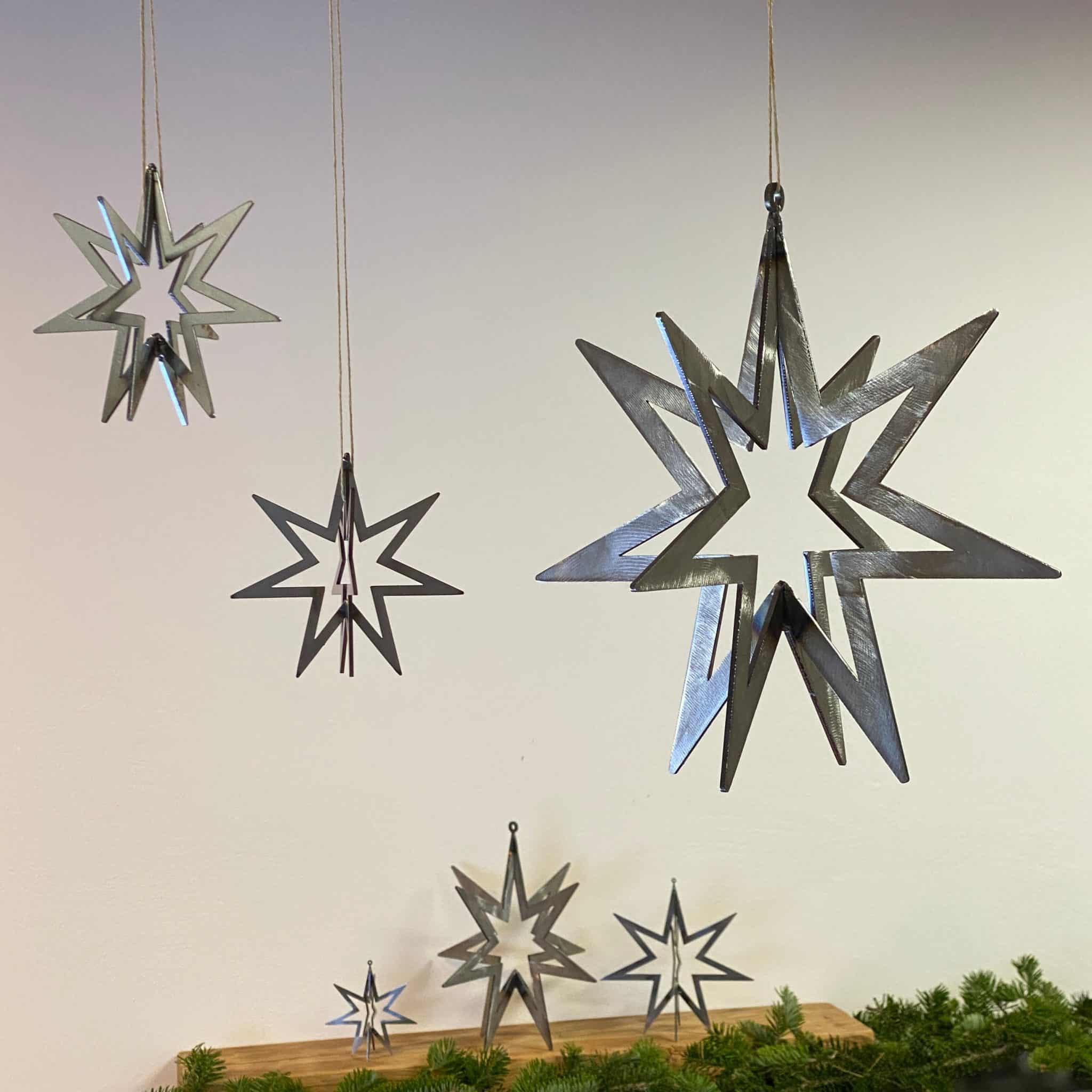 Stjernerne er lavet i massivt stål, og samlet i hånden. Den rå metalstruktur giver et nordisk og minimalistisk udtryk, som passer perfekt til både jul og helårsindretning. De kan stå frit som lille skulptur, hænge i vinduet, bruges i dekorationer eller gives som en helt særlig gave.