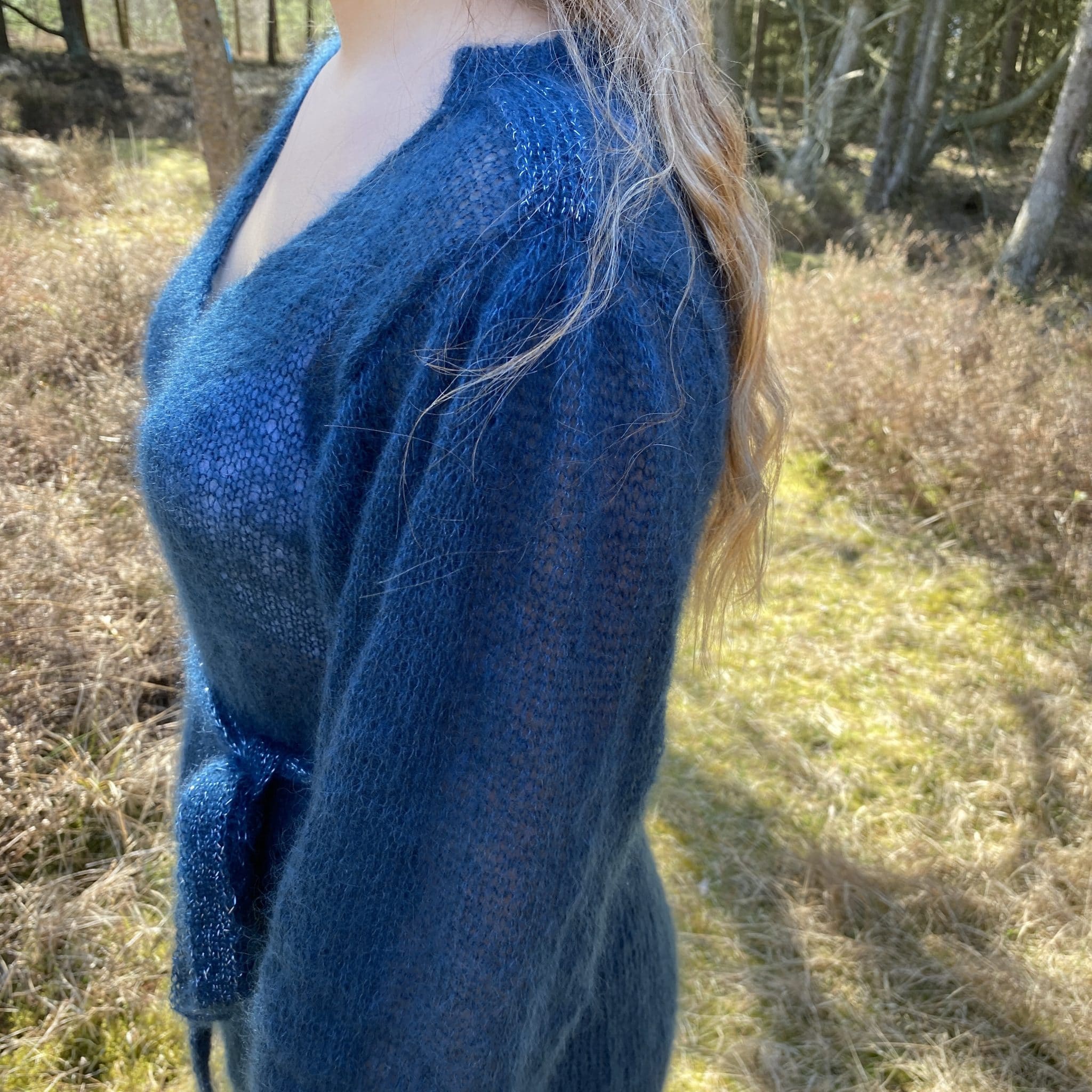 Denne tunika er strikket nedefra og op med slids i begge sider. Der er lavet pufærmer ved skuldren og over begge skuldre, er der strikket en skulderstrop med en glimmertråd i. Modellen har v-hals og bindebånd om livet, som også er strikket med glimmertråd.