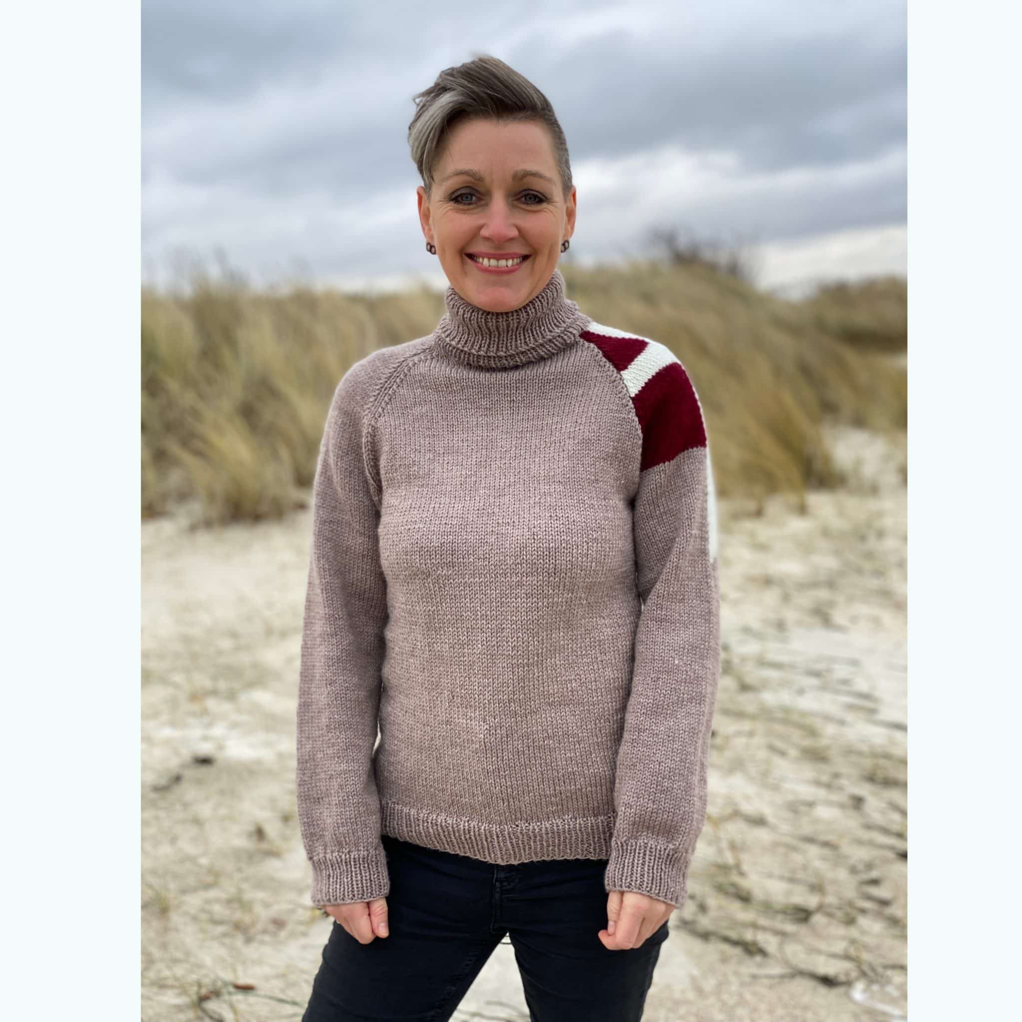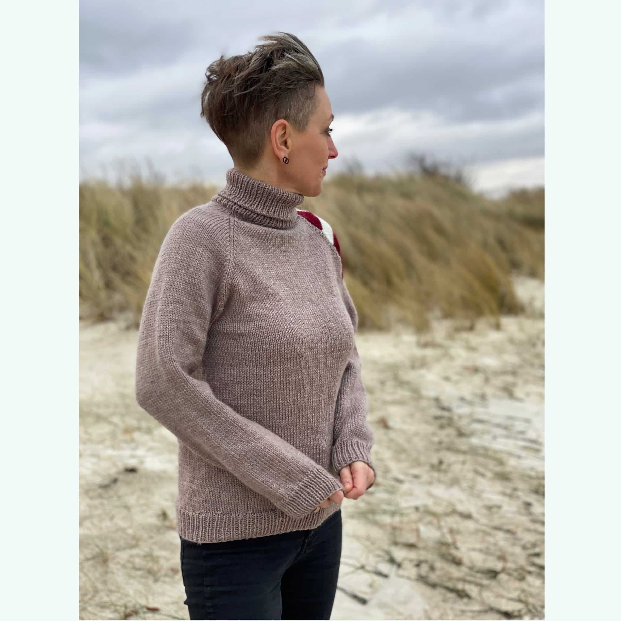 Denne model hedder Fædreland og har et fedt og cool udtryk. Det er en enkelt rullekrave med raglan ærmer, og den har en virkelig god pasform.