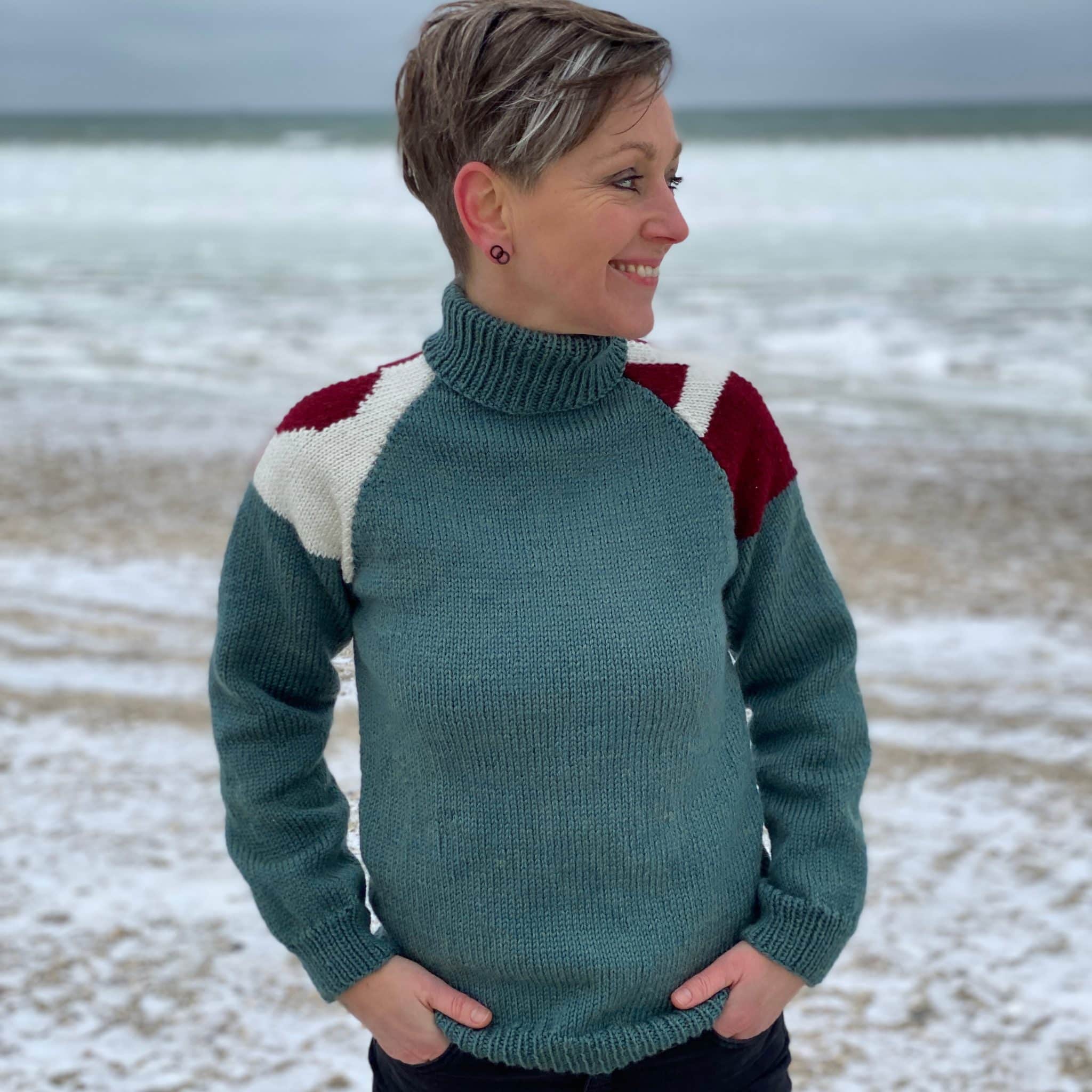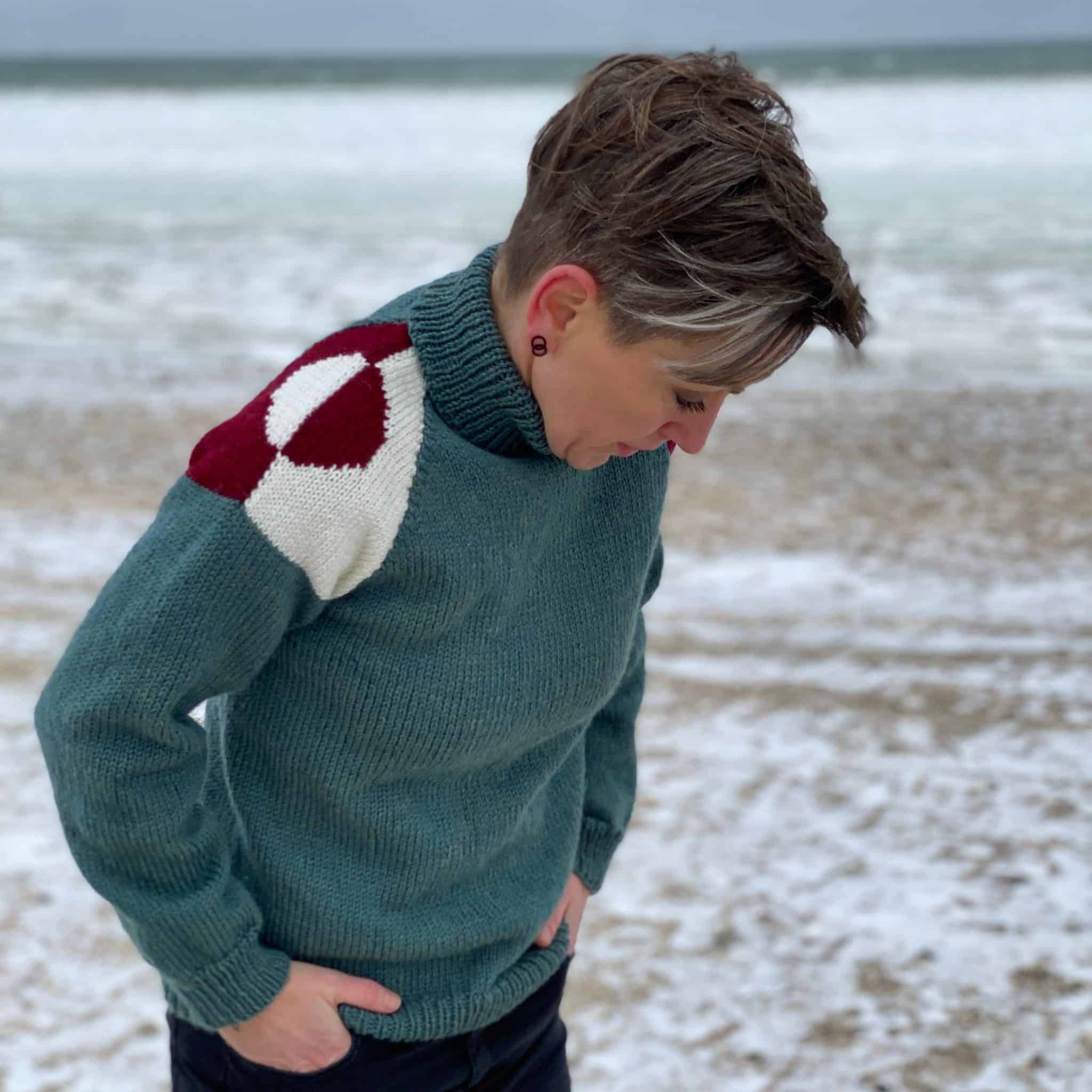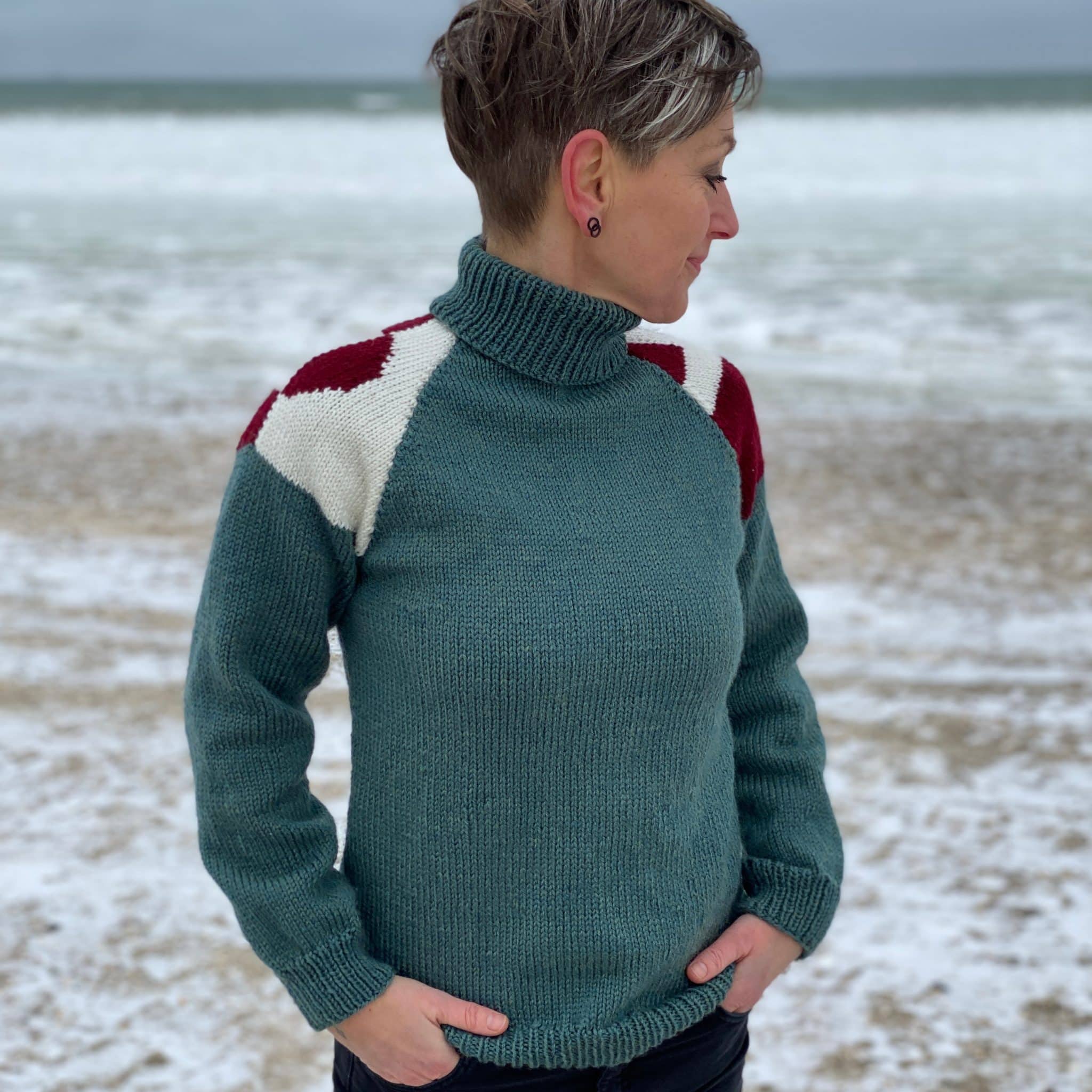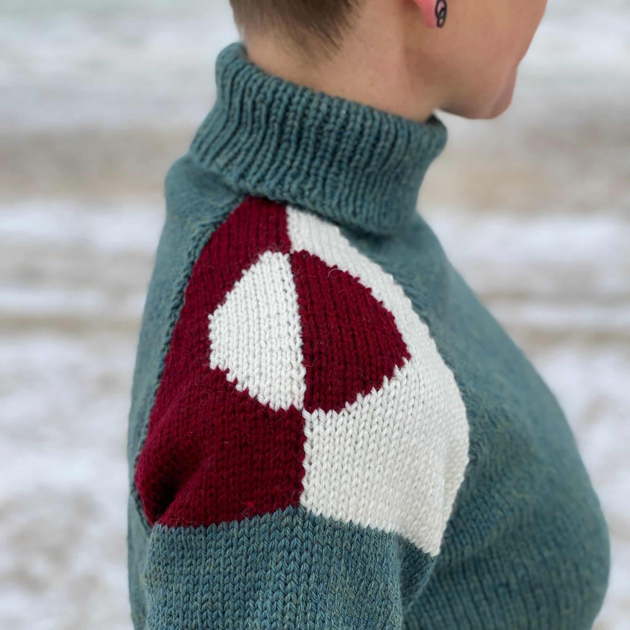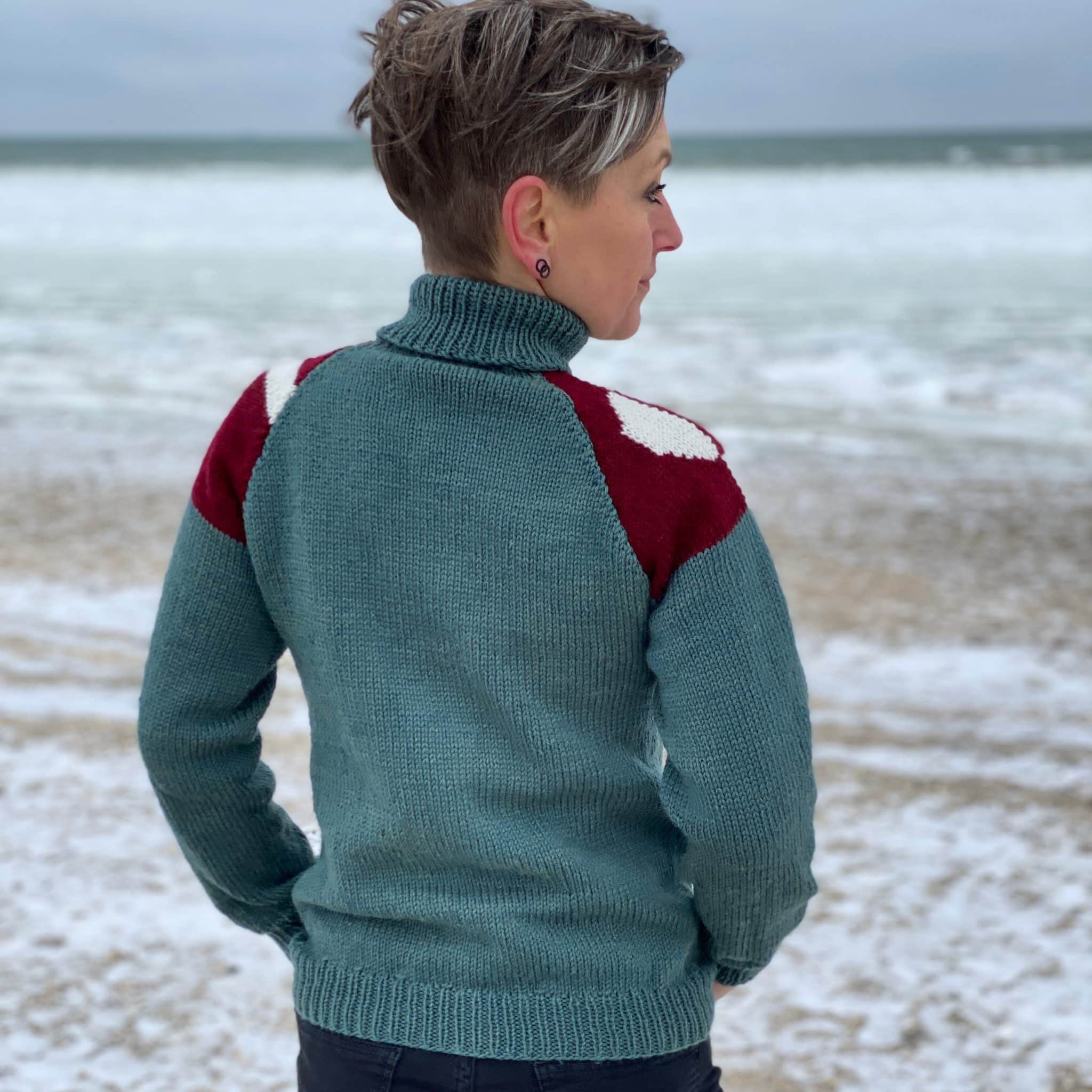 Den er strikket nedefra og op. Ærmerne er strikket hver for sig, og strikkes med, når der skal strikkes hals. Derefter bliver raglankanten syet fra vrangsiden.