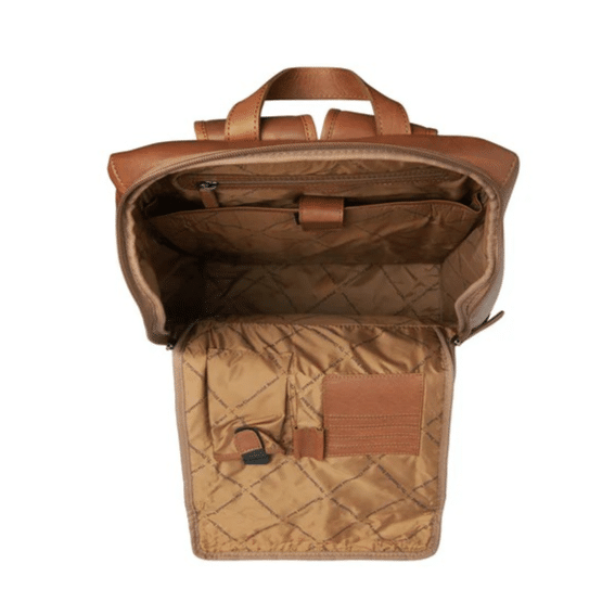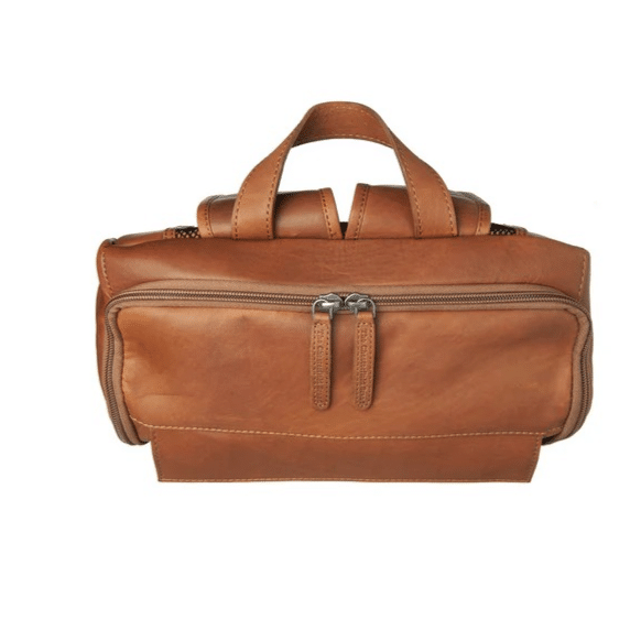Den eksklusive cognacfarvede rygsæk er udstyret med en smuk lynlåslukning i toppen samt to lynlåslommer på forsiden og endnu et ekstra rum.