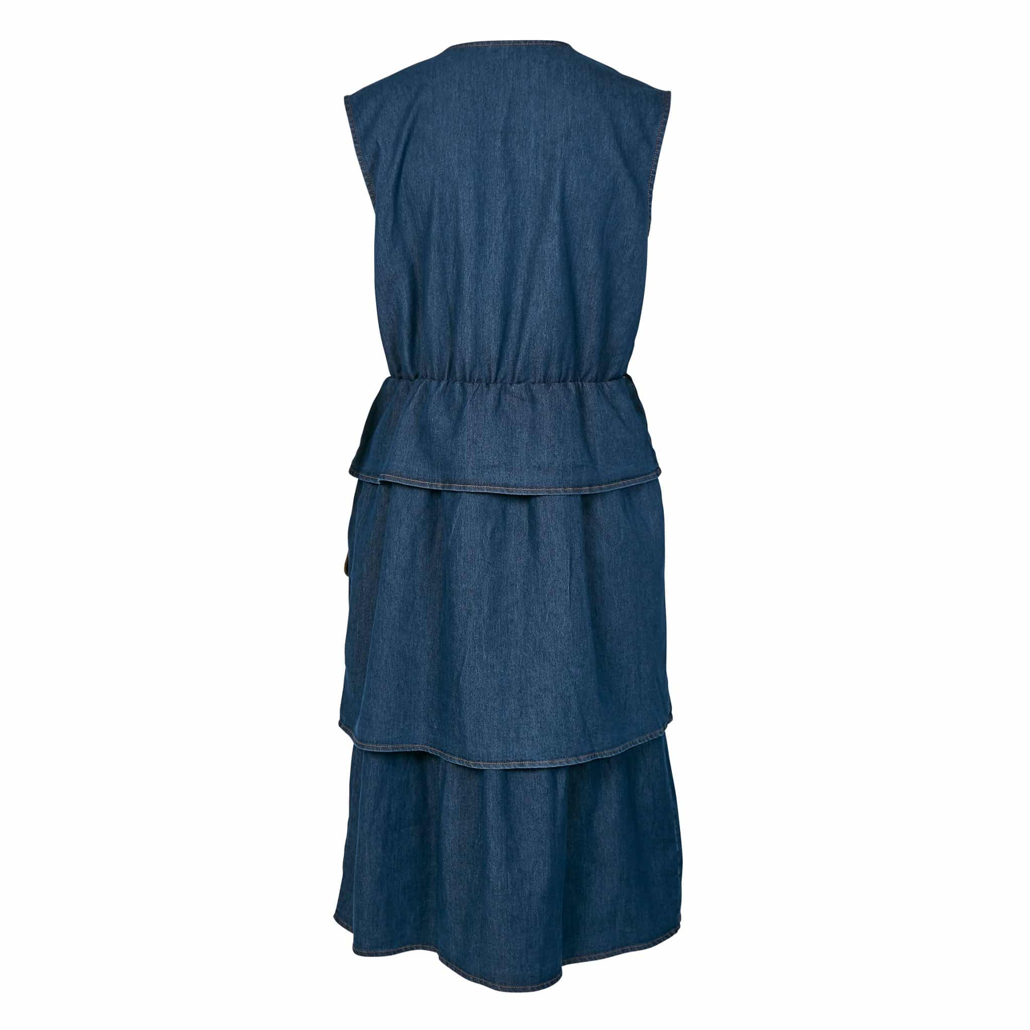 Denne ærmeløse kjole i denim har en feminin silhuet med slå-om effekt og elastik i taljen, som giver en flatterende pasform. Kjolen er opdelt i lag med let rynkede sømme, der skaber en blød struktur og bevægelse. Foran har den store påsyede lommer med kontrastkanter samt et bredt bindebælte, der understreger taljen.