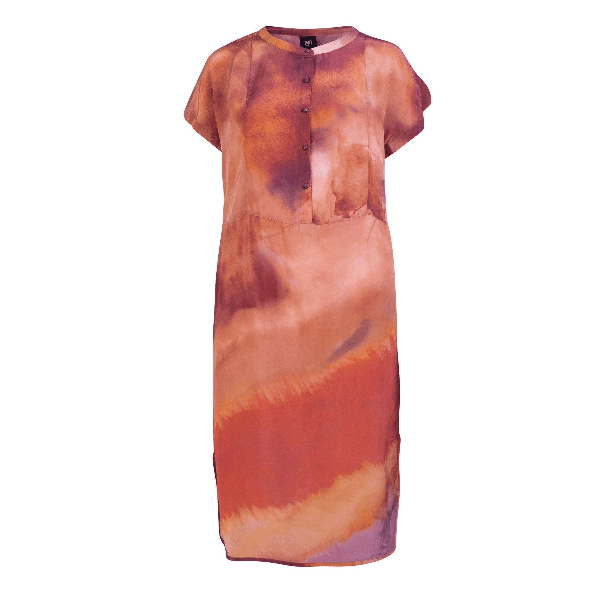 Denne ærmeløse kjole har et langt, flydende snit med fine læg under brystet, som giver et feminint og let draperet fald. Den bløde runding i halsudskæringen og det farverige print i dybe nuancer skaber et levende og kunstnerisk udtryk. Stoffet er let og behageligt – ideelt til varme dage