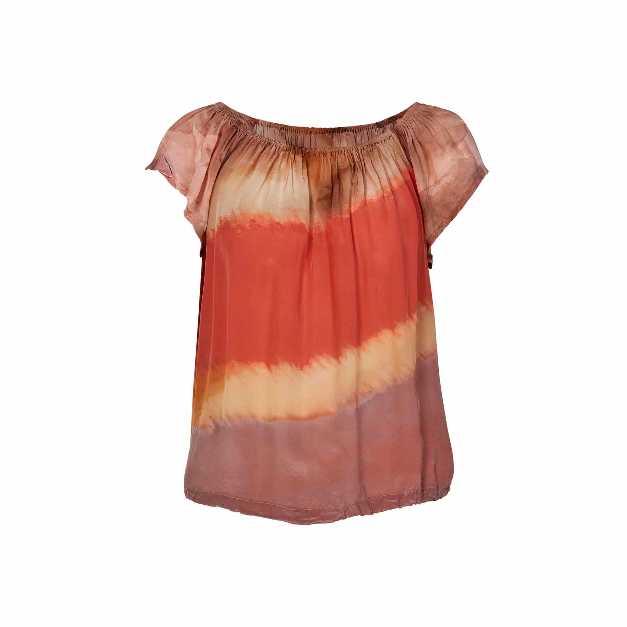 Denne top har en løs og luftig pasform med korte, let transparente ærmer og rynket elastikkant i halsudskæringen. De bløde folder giver et feminint fald, mens bindebånd foran og i siderne tilføjer fine detaljer og mulighed for justering. Det farverige print skaber et livligt og sommerligt udtryk.